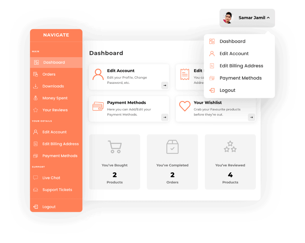 We always like to make sure that you get the Best Experience. That's why the Molti Ecommerce brings a never before seen My Account Experience for WooCommerce that will blow your mind away. It has been Designed in a way that It looks like a busy Dashboard but It's actually a clean & sleek My Account Page with so stunning Animations, Profile Card and Dropdown Menu.